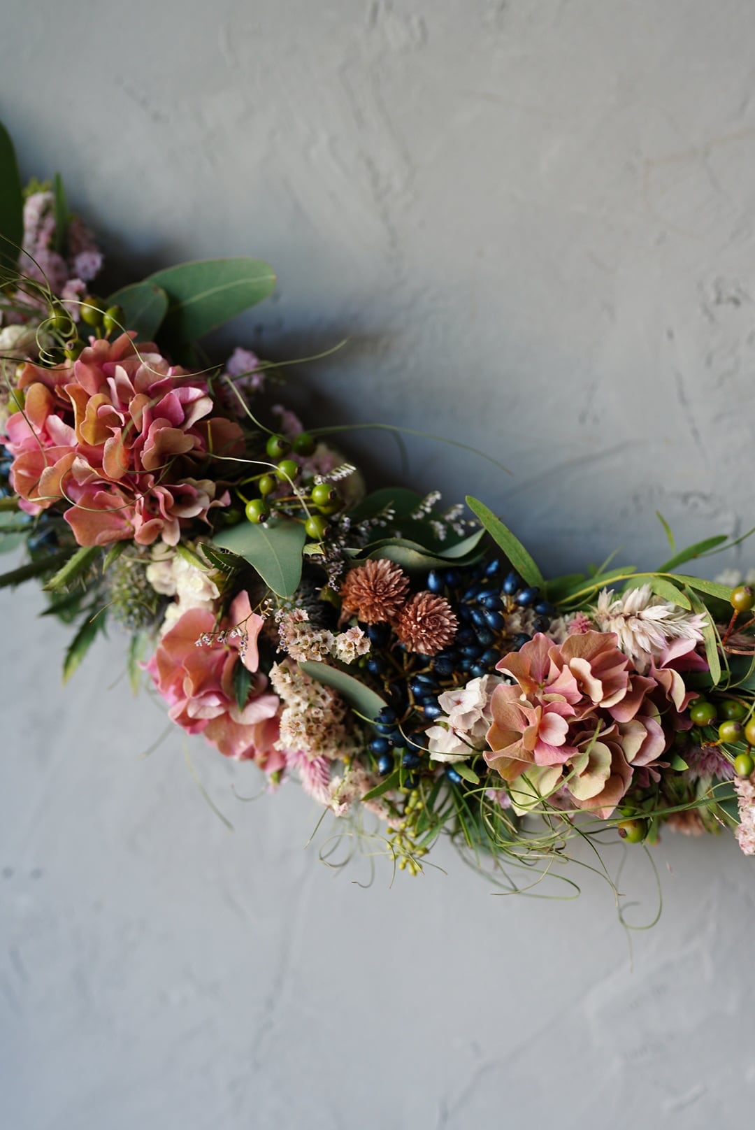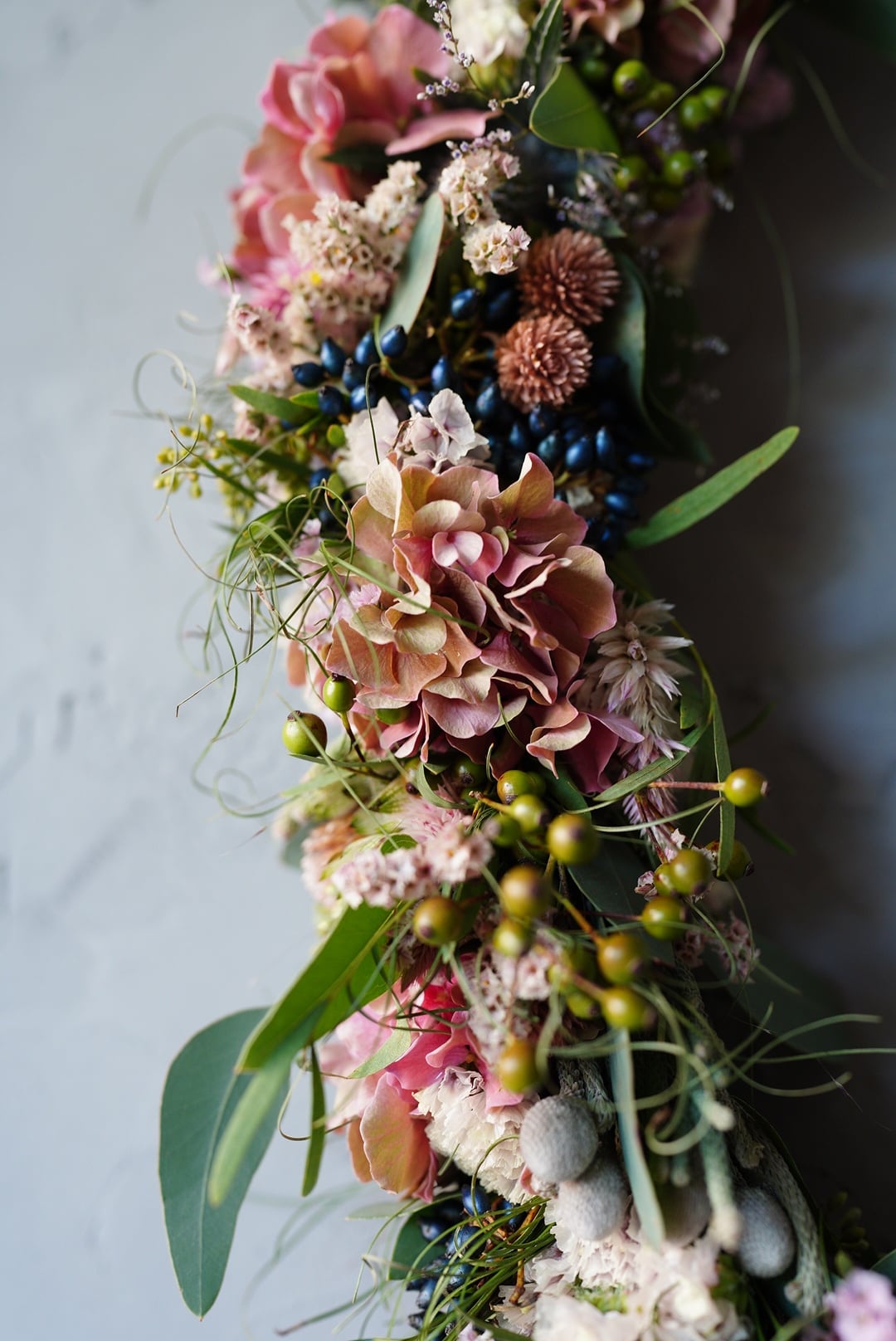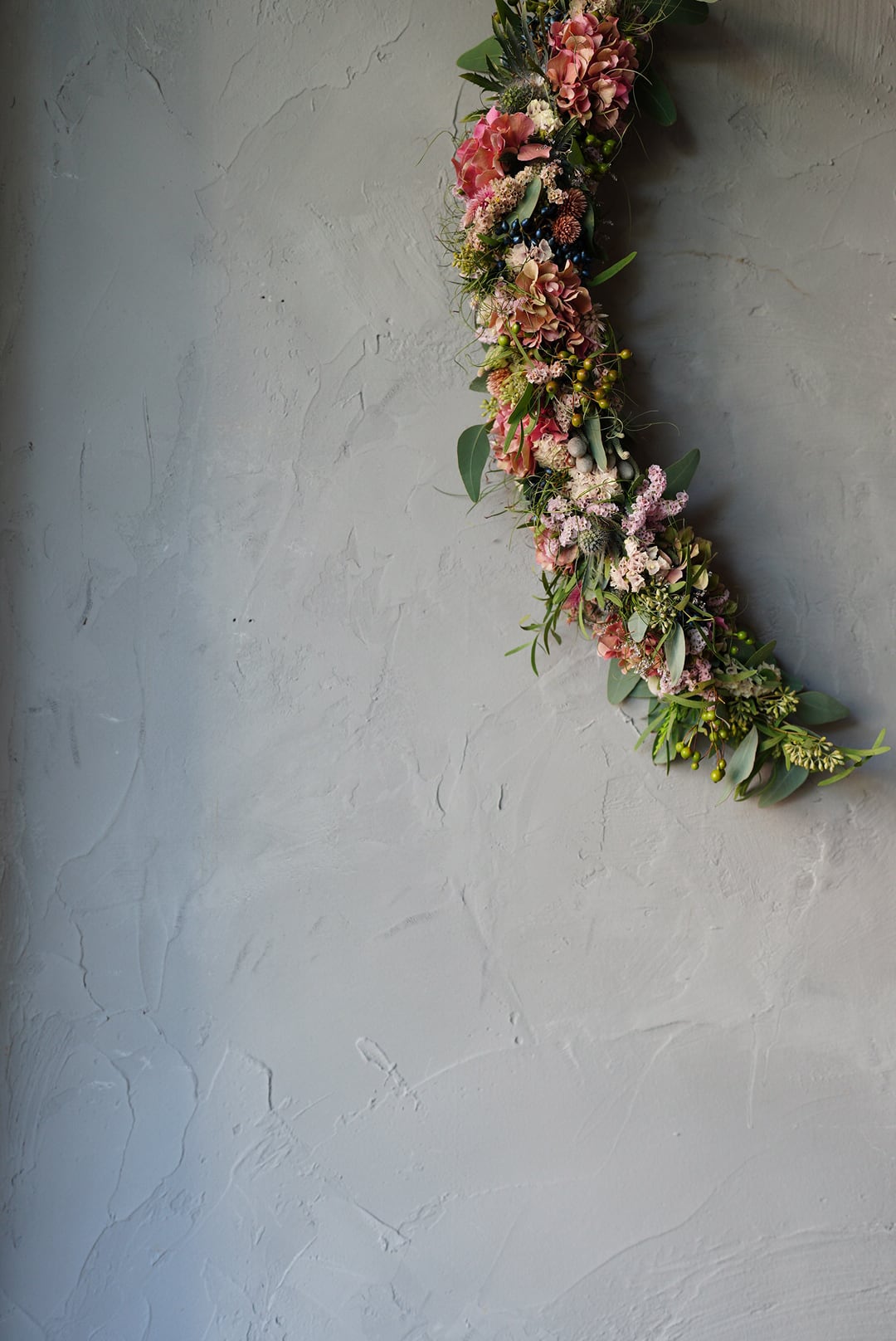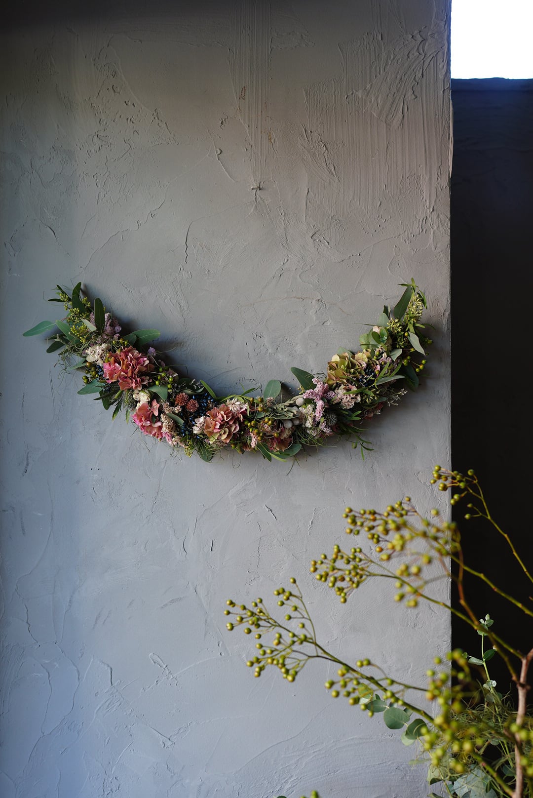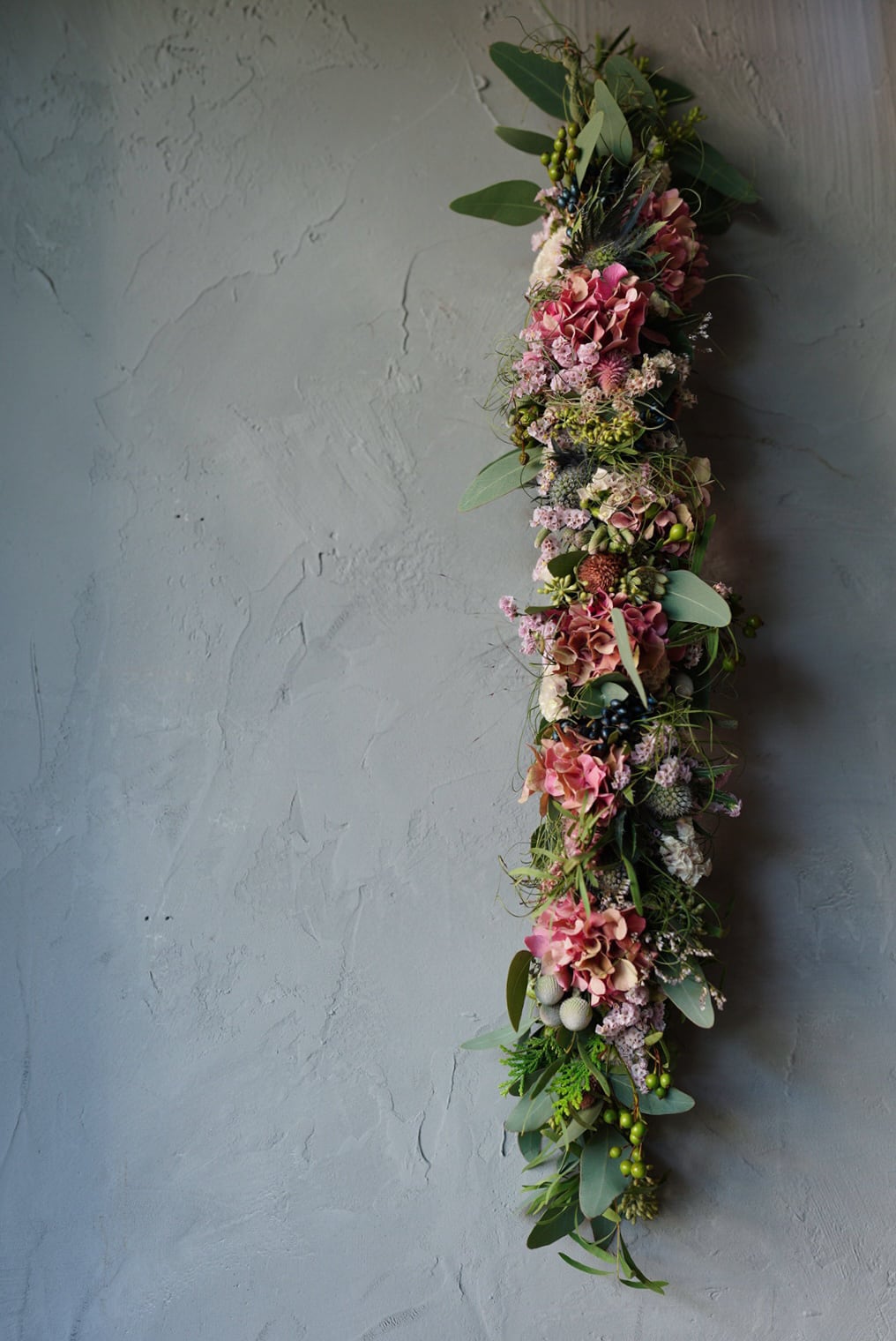 アンティーク紫陽花やスターチス、さまざまな実などを繊細に繋げたガーランドです。
