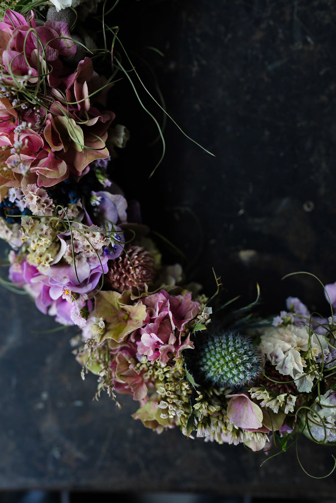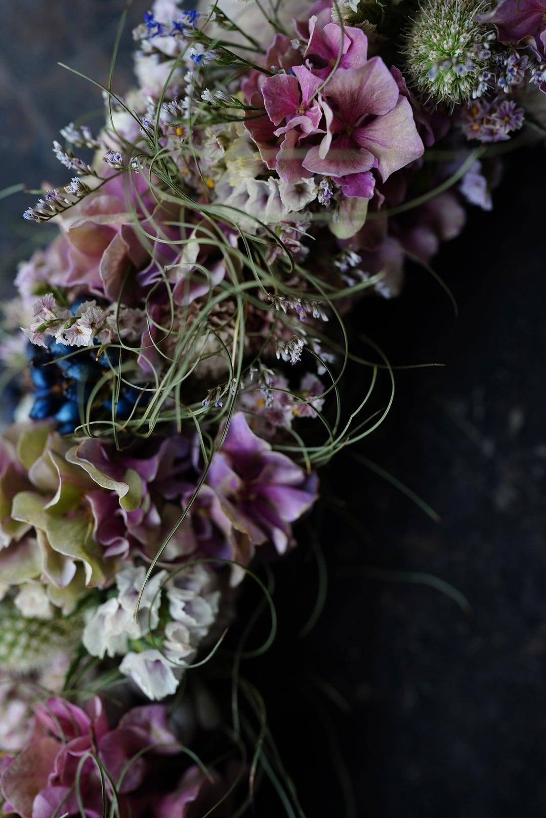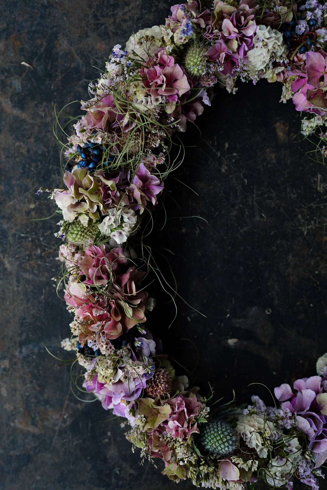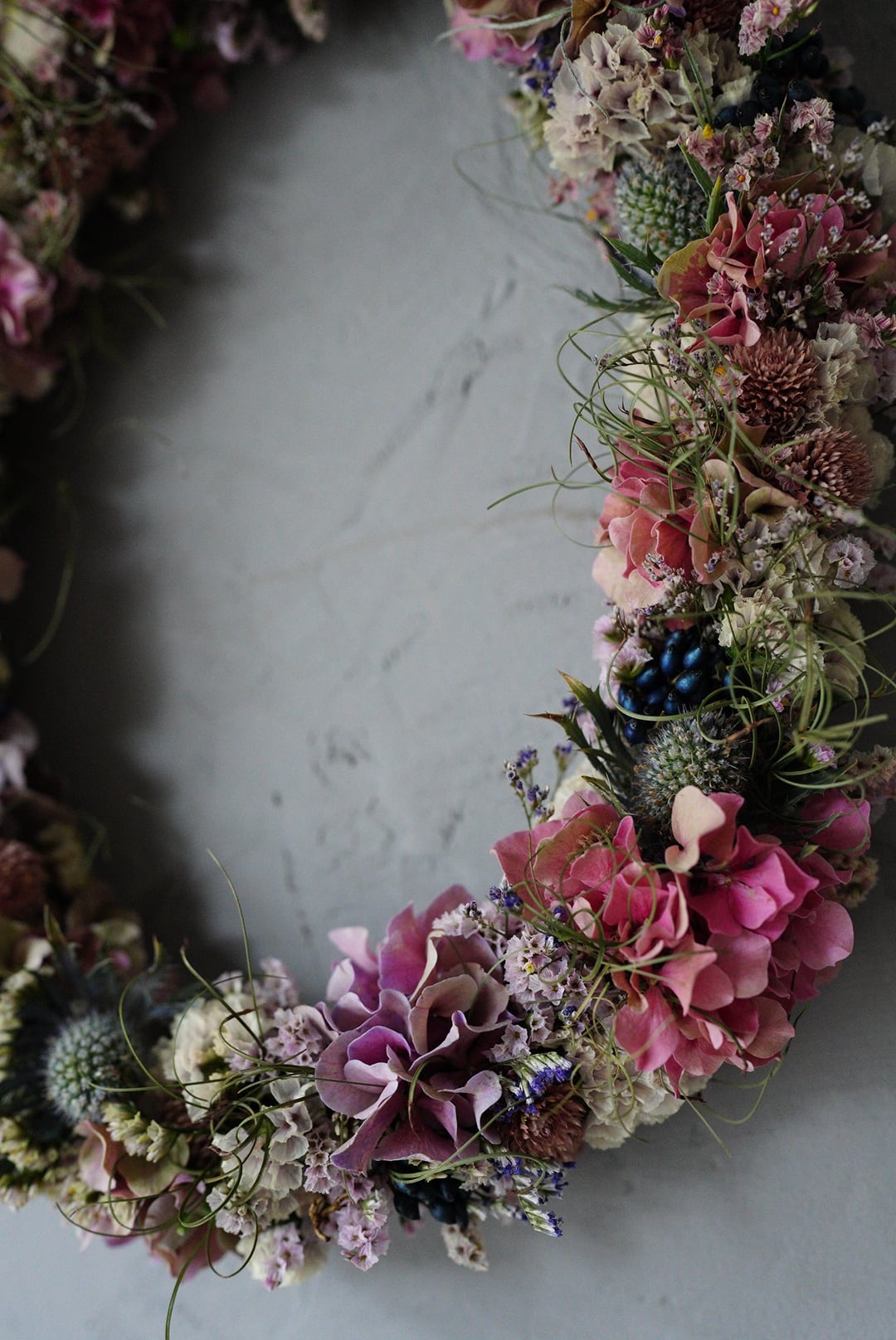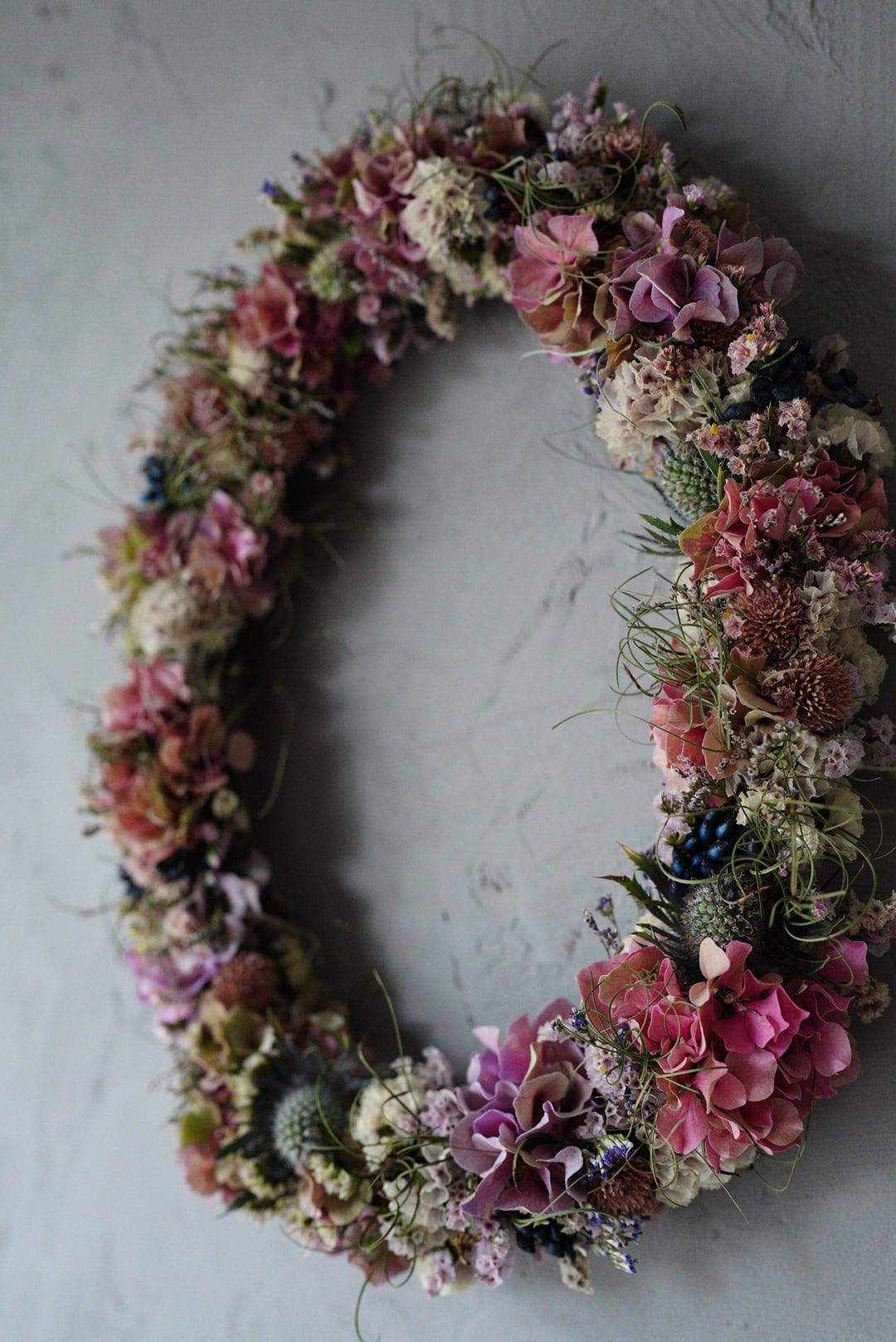 ピンク色の紫陽花やスターチス、実ものを細く繋げた楕円形のオーバルリースです.。