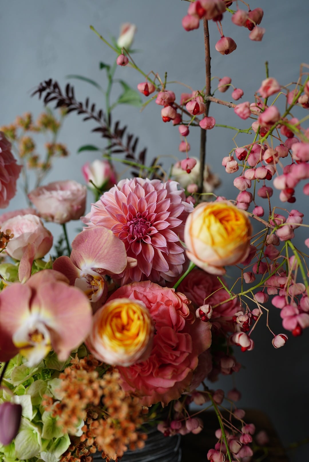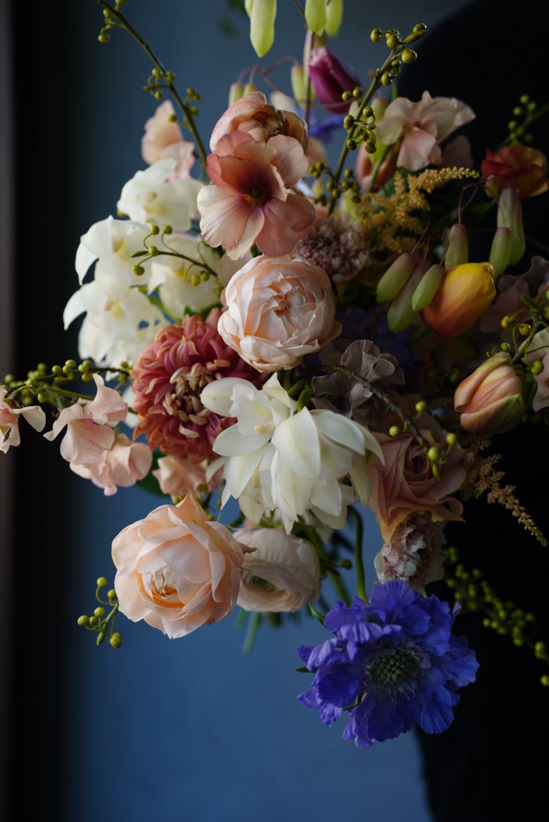 花材のご指定は出来かねますが、優しく、大人っぽくなどお色目のイメージにご希望がございましたら可能な限り対応させていただきます。