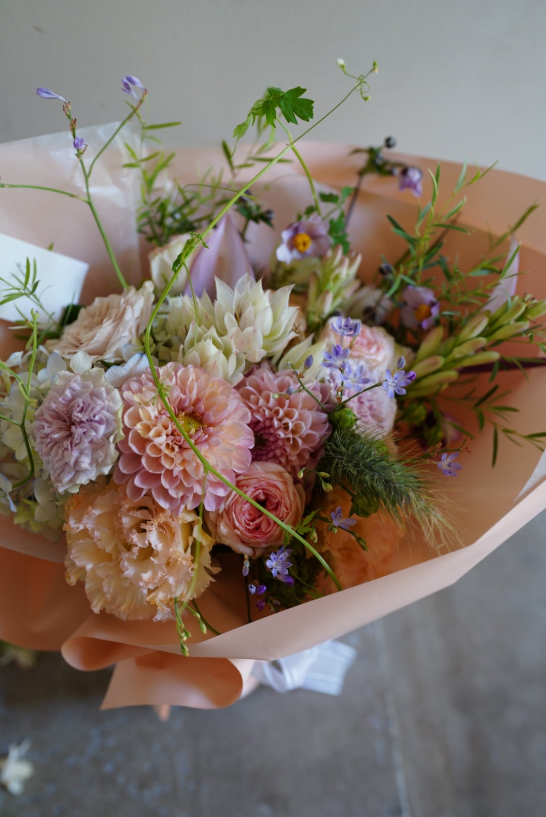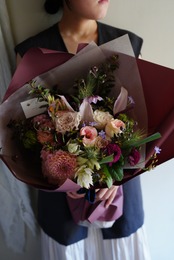 花材のご指定は出来かねますが、優しく、大人っぽくなどお色目のイメージにご希望がございましたら可能な限り対応させていただきます。