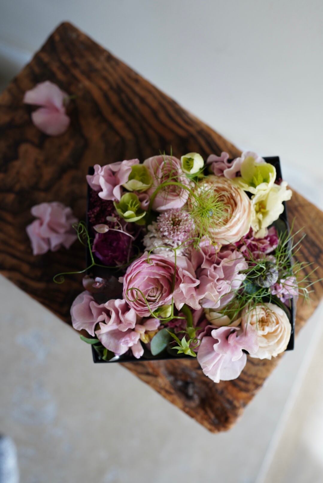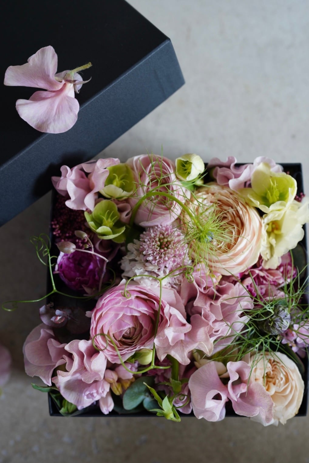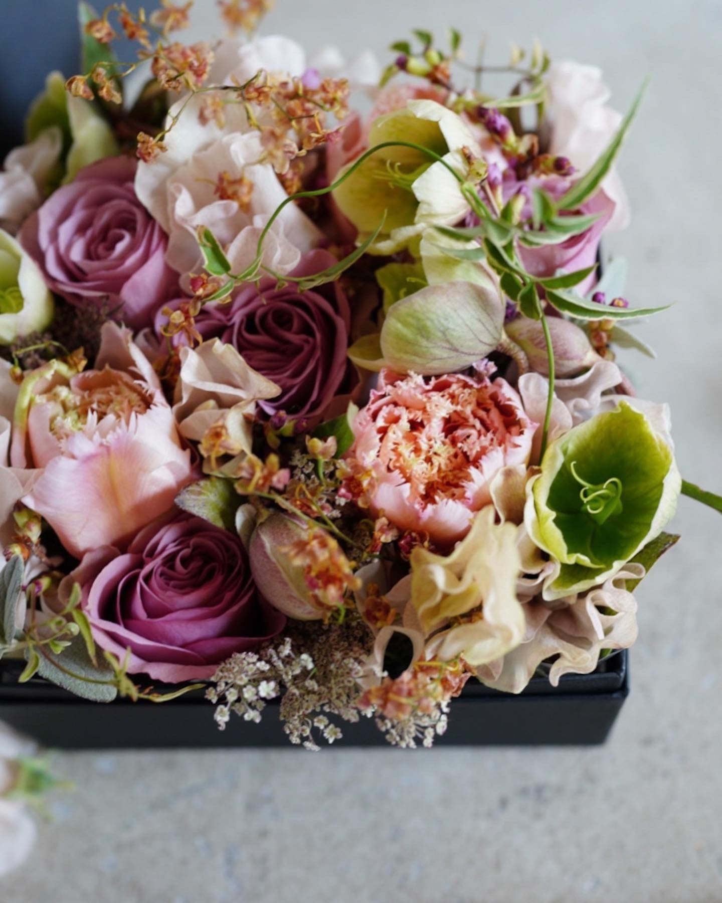 ボックスの中にお花を詰め込んだ、開けた時に嬉しさがあふれるアレンジメントです。
