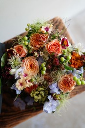 花材のご指定は出来かねますが、優しく、大人っぽくなどお色目のイメージにご希望がございましたら可能な限り対応させていただきます。